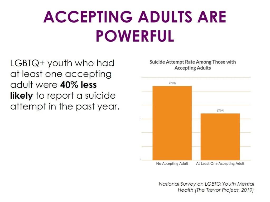 Research shows that just one supportive adult can reduce the risk of suicide in LGBTQ+ youth by 40%. You don’t need a PhD in gender studies to be that person, just practice radical acceptance and validation.